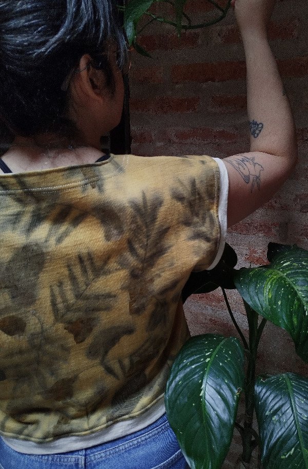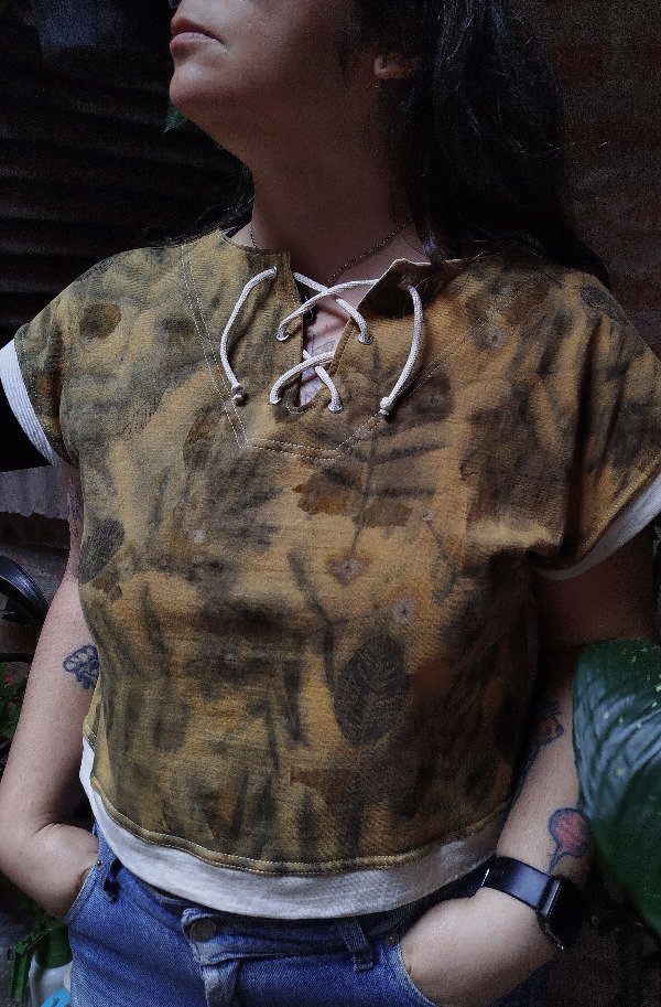 Confeccionada en jersey de algodón natural con teñido artesanal y ecoprint de guayaba y aguaribay.